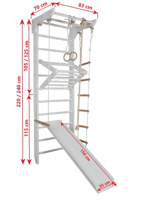 - Nosivost: Ribstol do 150 kg | Gornja šipka do 100 kg | Dječja trokutasta šipka do 50 kg | Viseći elementi do 60 kg