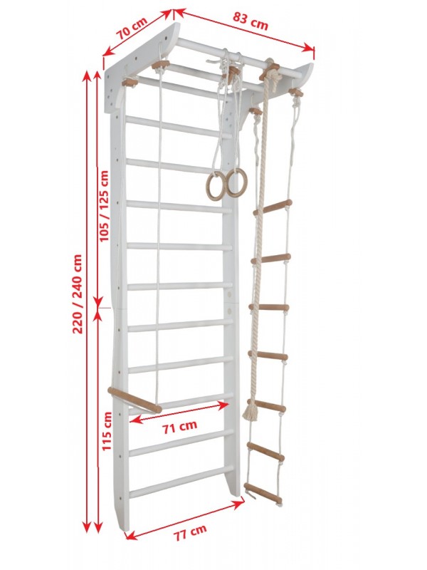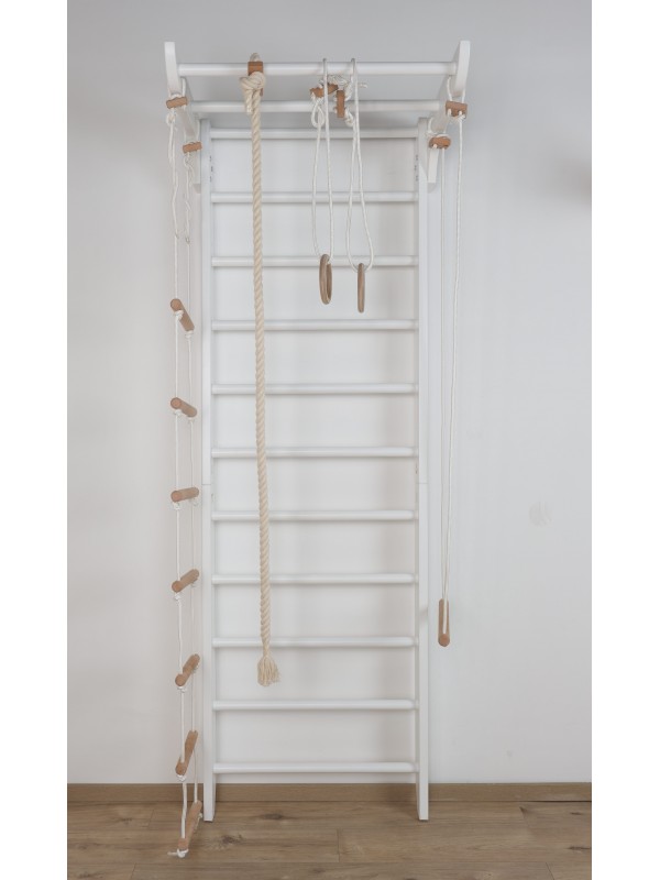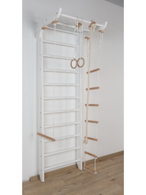 Tražite višenamjensku sportsku opremu koja će oduševiti djecu, a istovremeno omogućiti vježbanje odraslima? Naše bijele drvene zidne ljestve s dodacima savršeno su rješenje za aktivan život kod kuće – sigurne, kompaktne i izrađene od visokokvalitetnih prirodnih materijala. Elegantna bijela boja savršeno se uklapa u svaki prostor, donoseći osjećaj svježine i čistoće.