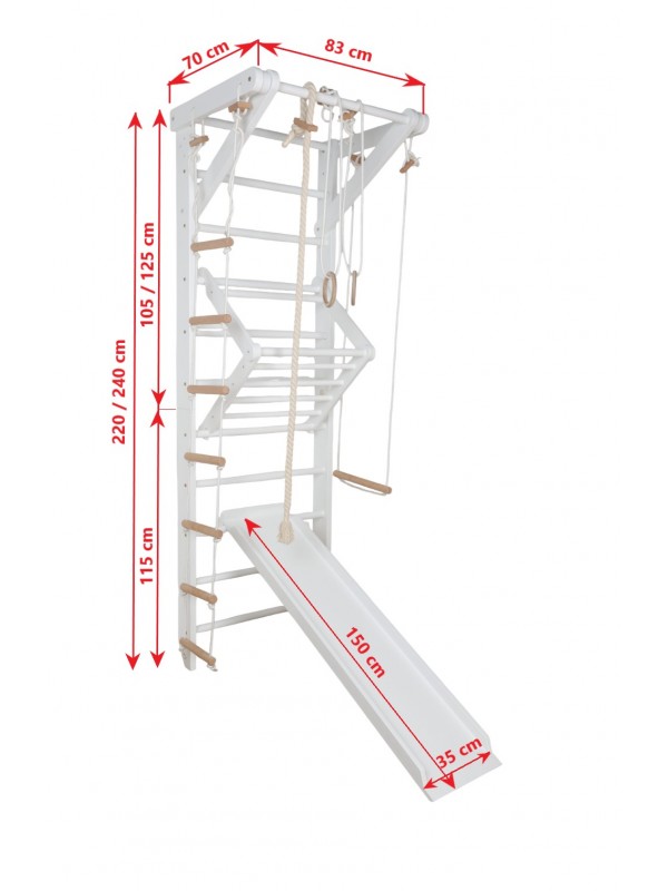 - Nosivost: Ribstol do 150 kg | Gornja šipka do 100 kg | Dječja trokutasta šipka do 50 kg | Viseći elementi do 60 kg