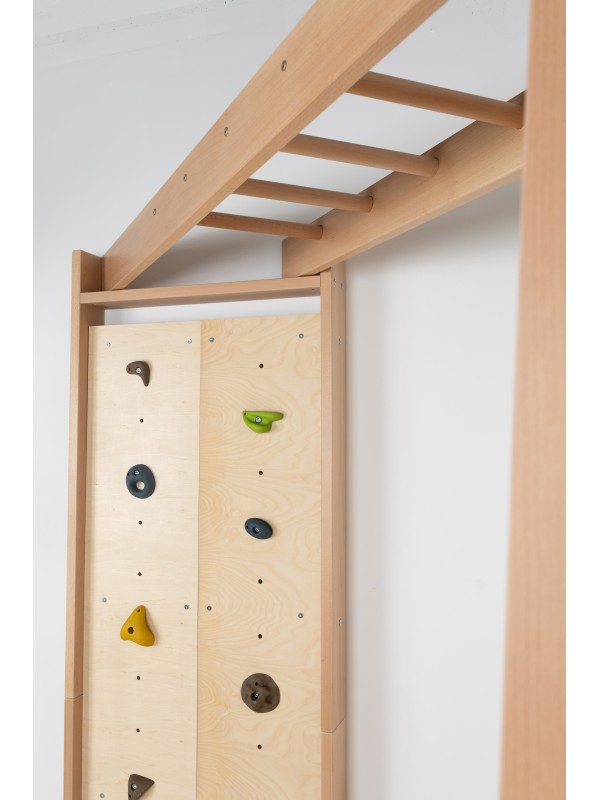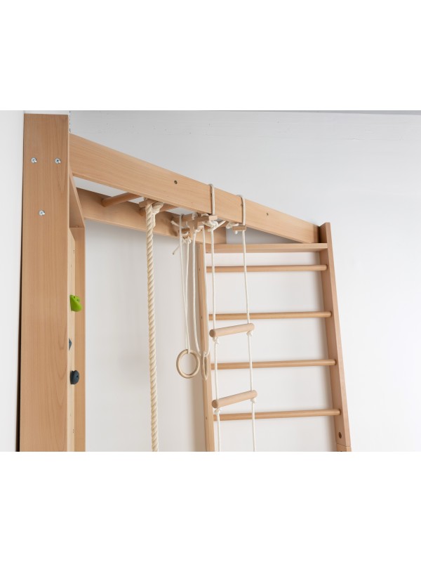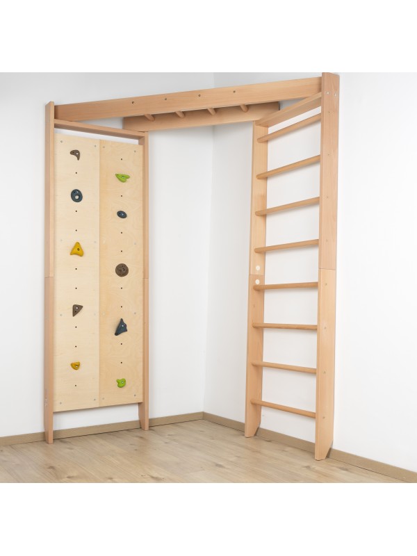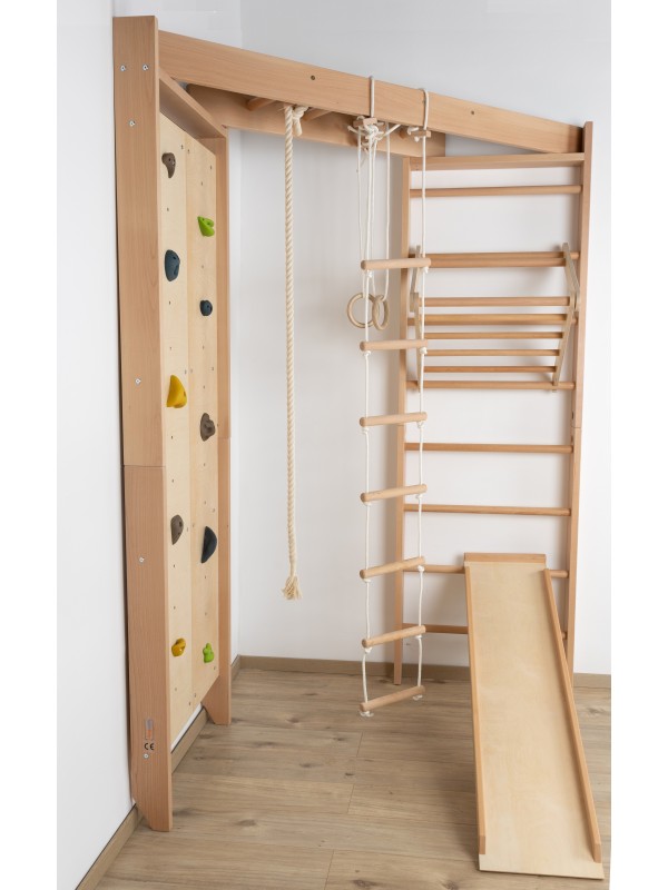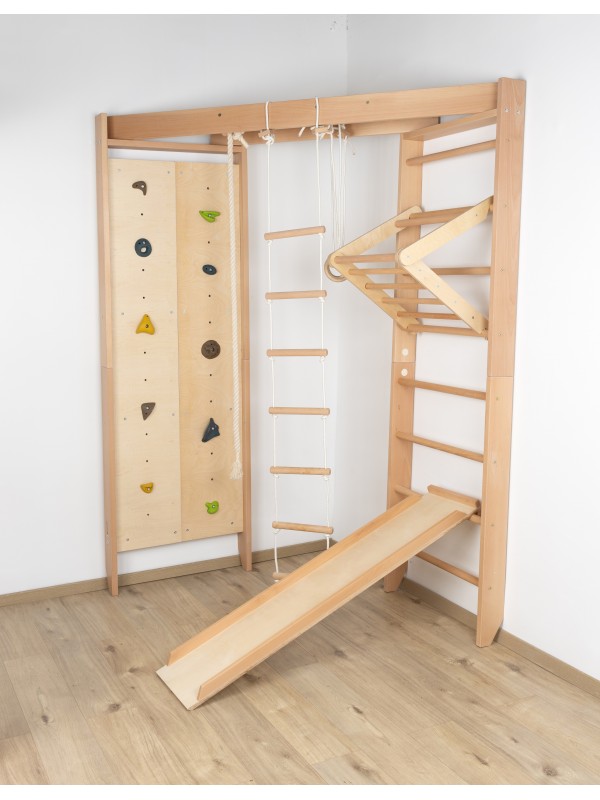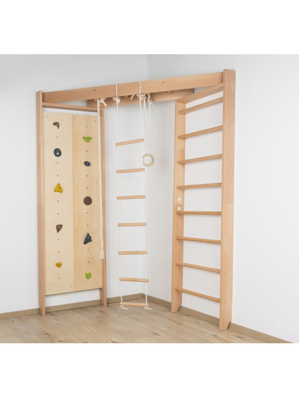 Višenamjenski unutarnji pribor za igru, kretanje i vježbanje za sve uzraste. Čvrsto bukovo drvo osigurava stabilnost, sigurnost i prirodan izgled, dok promišljen dizajn potiče kretanje i zajedničko provođenje vremena. Corner je kutni ljestvičar koji zauzima malo prostora i prikladan je za svaki dom, čak i za manje stanove.