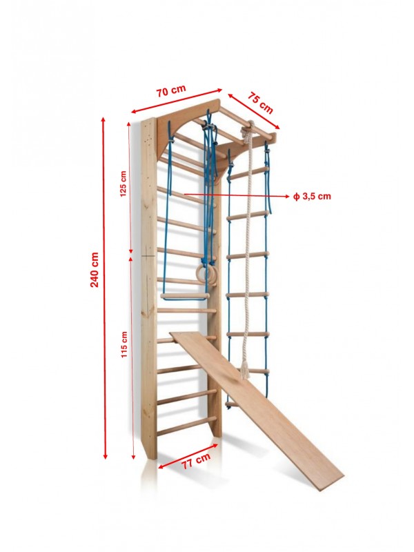 - Nosivost: Ribstol do 150 kg | Pomična gornja šipka do 80 kg | Odvojiva dječja šipka do 50 kg | Viseći elementi na užadima do 60 kg